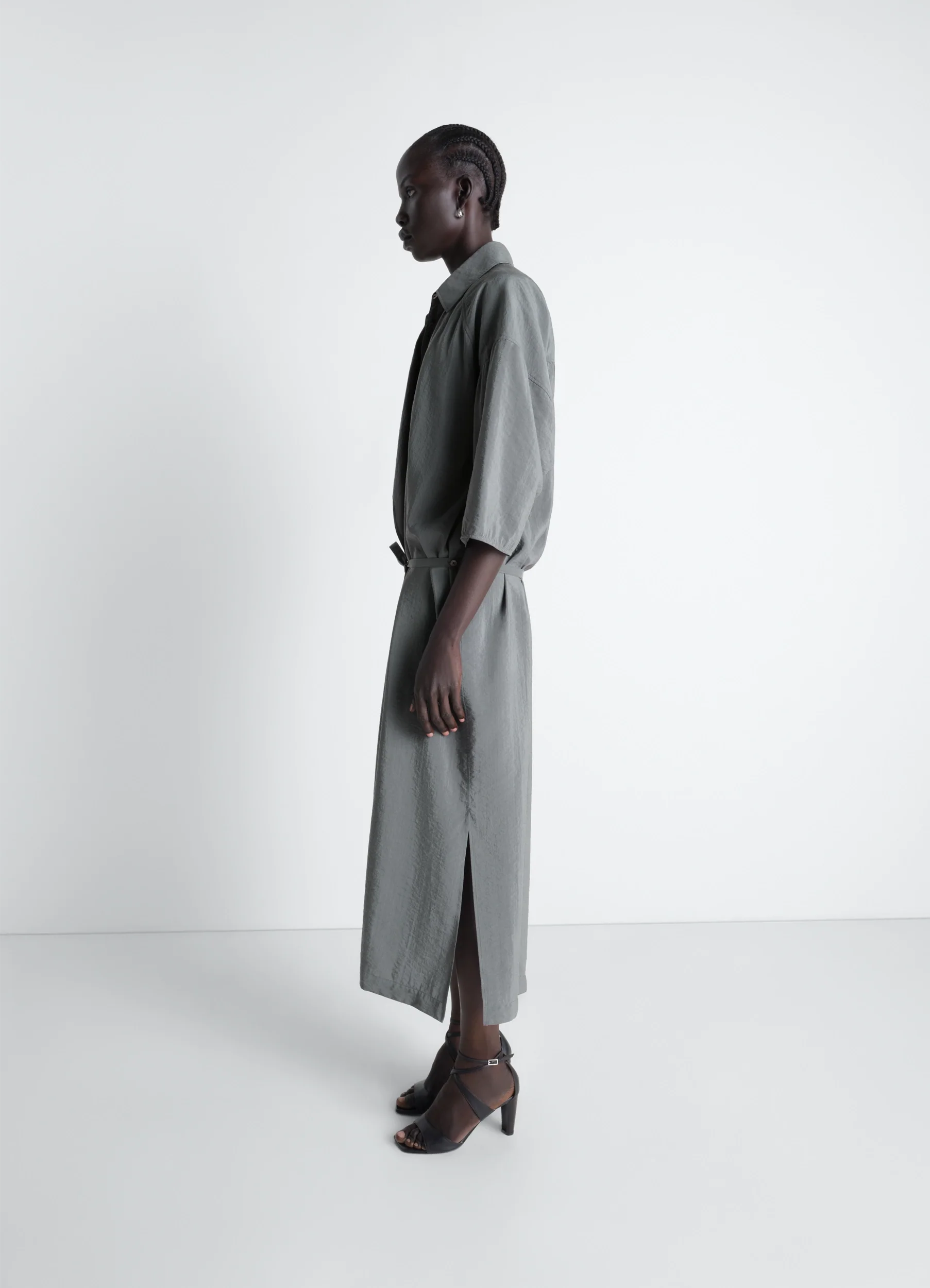 A new take on an iconic LEMAIRE wardrobe piece, this dress is crafted from dry silk, a signature LEMAIRE fabric with a soft and textured hand with a satin-like sheen. Its wide cut is complemented by sleeves that end after the elbow and are slightly gathered. Dropped shoulders give it a certain volume while, in the center front, an asymmetrical flap drapes femininely, highlighted by contrasting box pleats. The dress can be tied with a belt in the same material, buttoned at the sides.