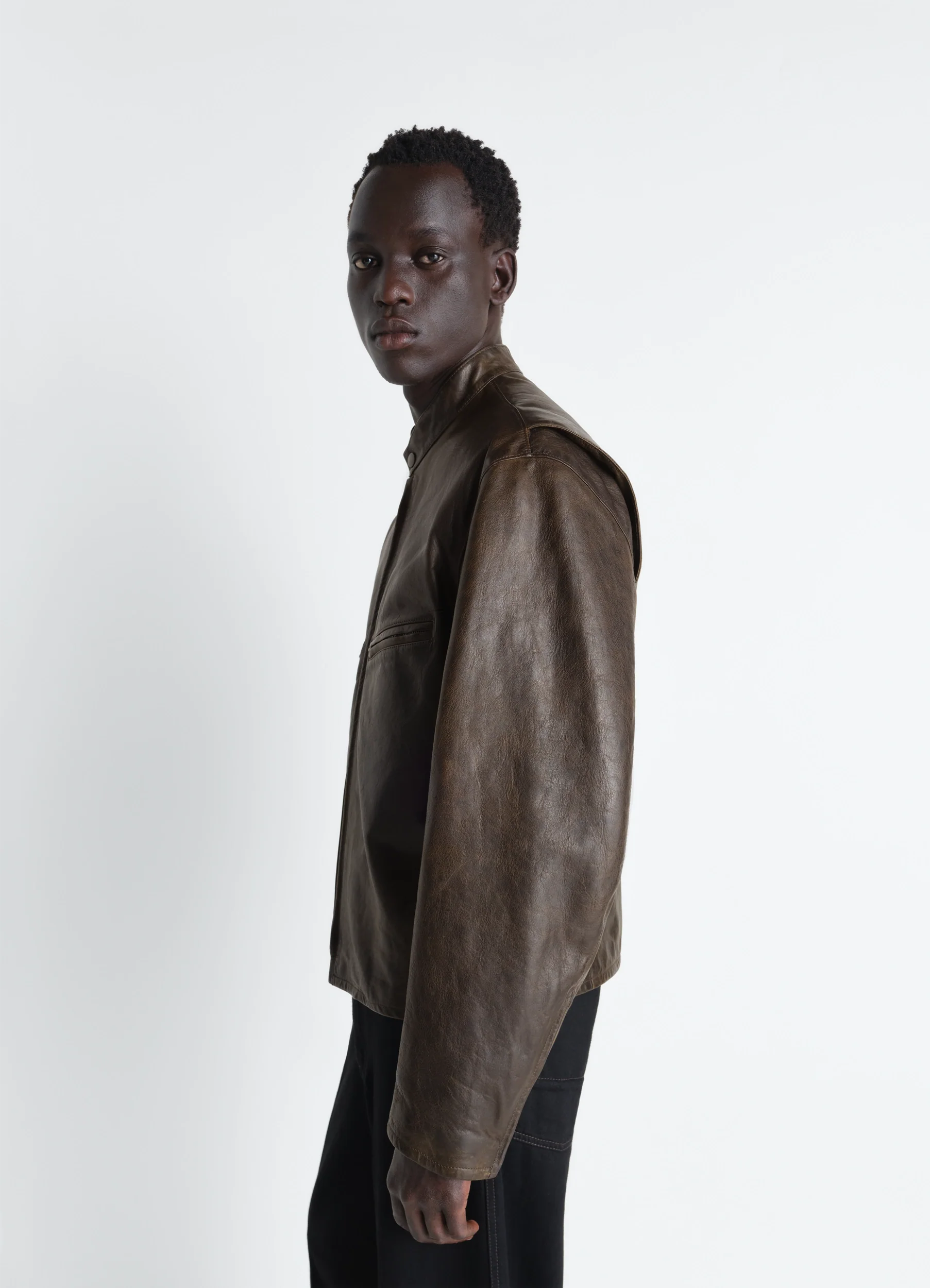 This boxy biker jacket completes LEMAIRE’s summer wardrobe. It is crafted from waxed cowhide.