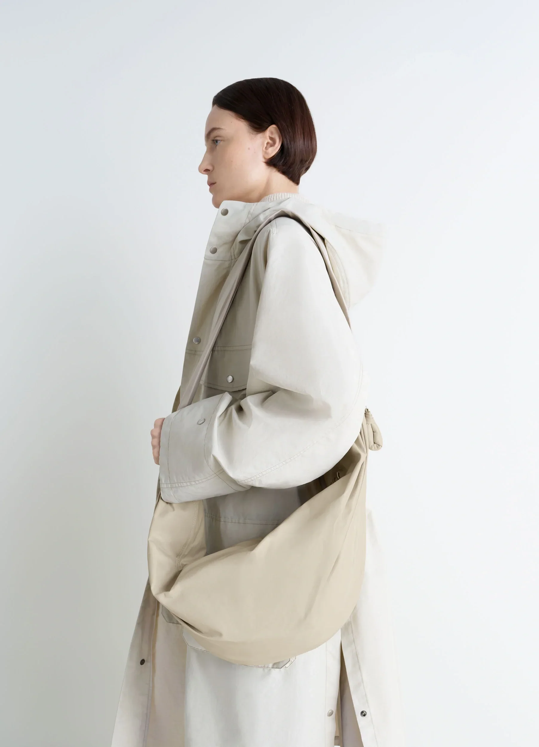 The Croissant line is emblematic of the Lemaire wardrobe. This versatile bag features a curve inspired by the viennoiserie of the same name, created in the Soft version by side pleats and knotted elements. This large bag is made of paper-effect leather, a light, resistant material characterized by its shiny appearance, certified LWG Gold.