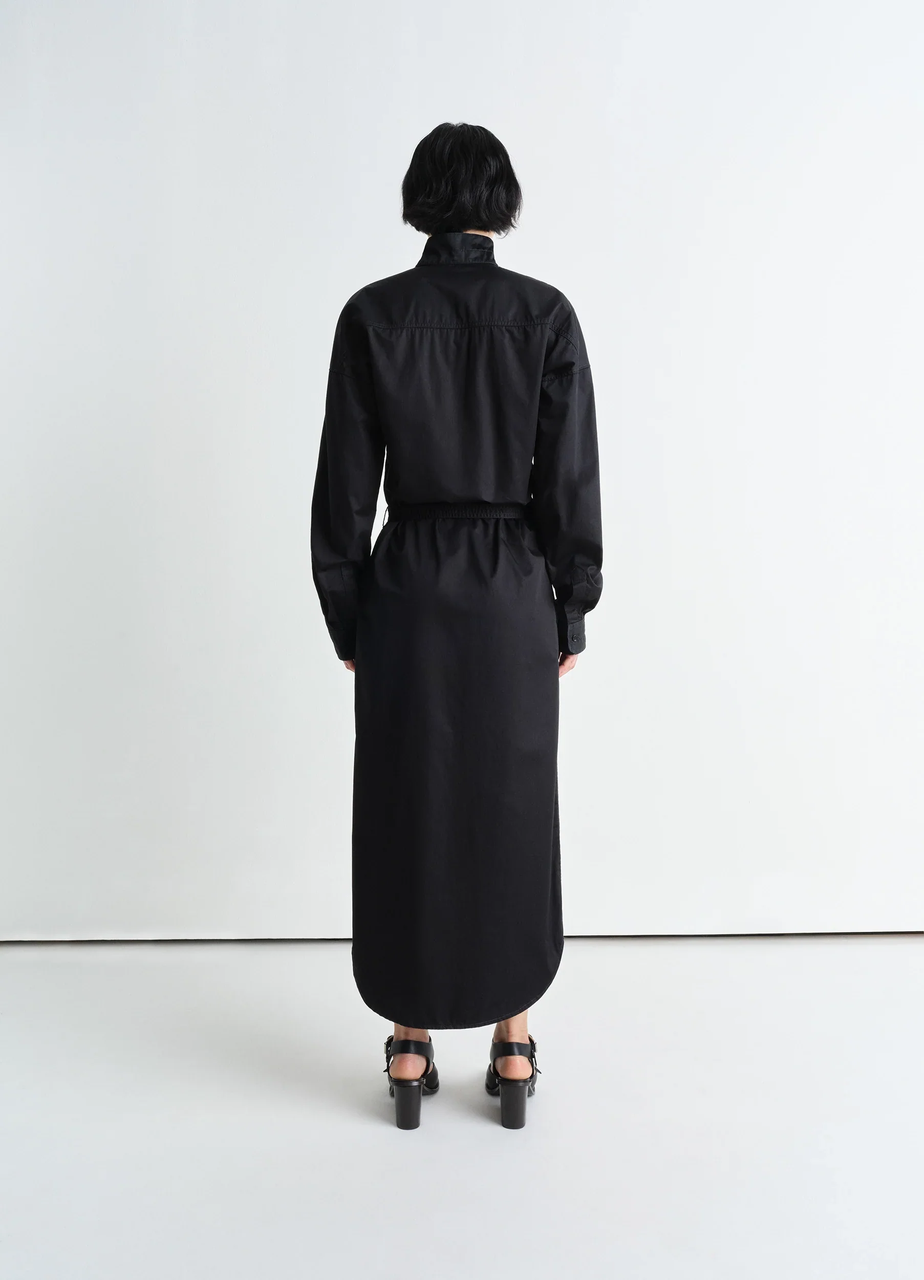The iconic Shirt Dress is reimagined this season at LEMAIRE in a long version that falls below the knee. Inspired by classic shirting details, it is crafted from light cotton satin, offering a soft touch and fluid texture with a subtle sheen, and features a straight cut throughout the body. This style includes a buttoned stand collar, classic shirt cuffs, and two stitched chest pockets for a utilitarian touch. Its removable belt boasts a single large flap pocket to wear elegantly at the hip.
