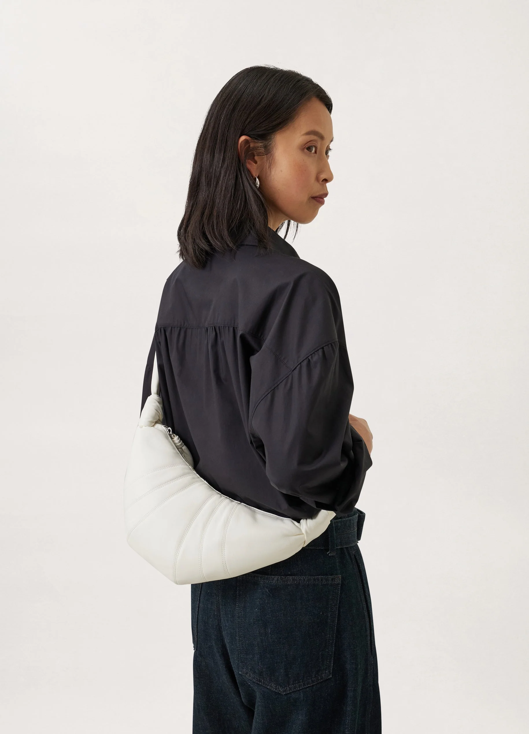 This classic LEMAIRE bag, the smallest of the Croissant Bag family, is made of smooth nappa leather with a soft touch. Inspired by the shape of a croissant pastry, the bag's design is achieved through an assembly of topstitched cutouts. It features a matching looped zip puller, and side knot finishings. It is worn on the shoulder or as a crossbody bag.