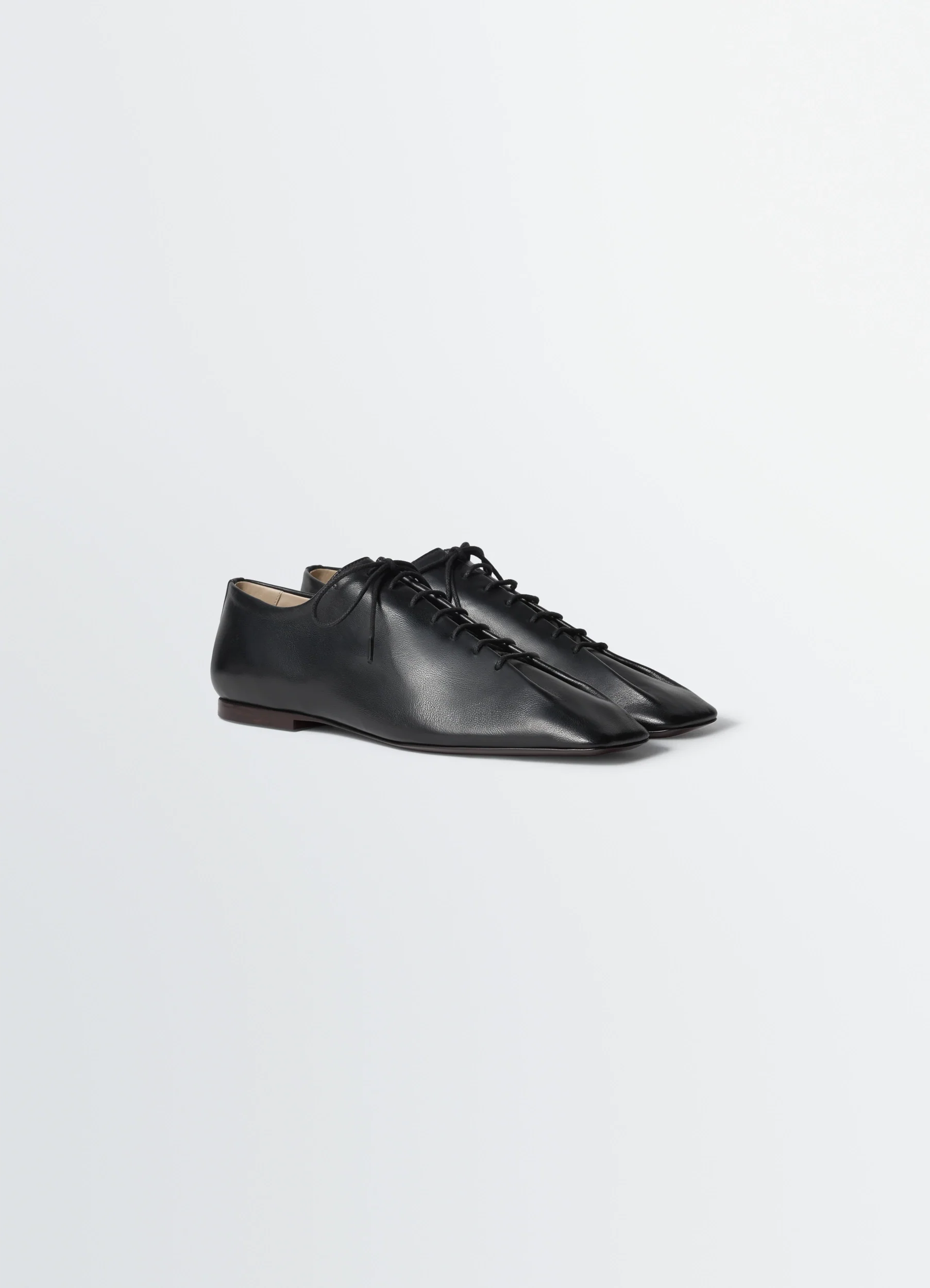 These flat derbies are made from LWG Gold-certified nappa lambskin leather, a soft, supple material characterized by its smooth feel and shiny appearance.